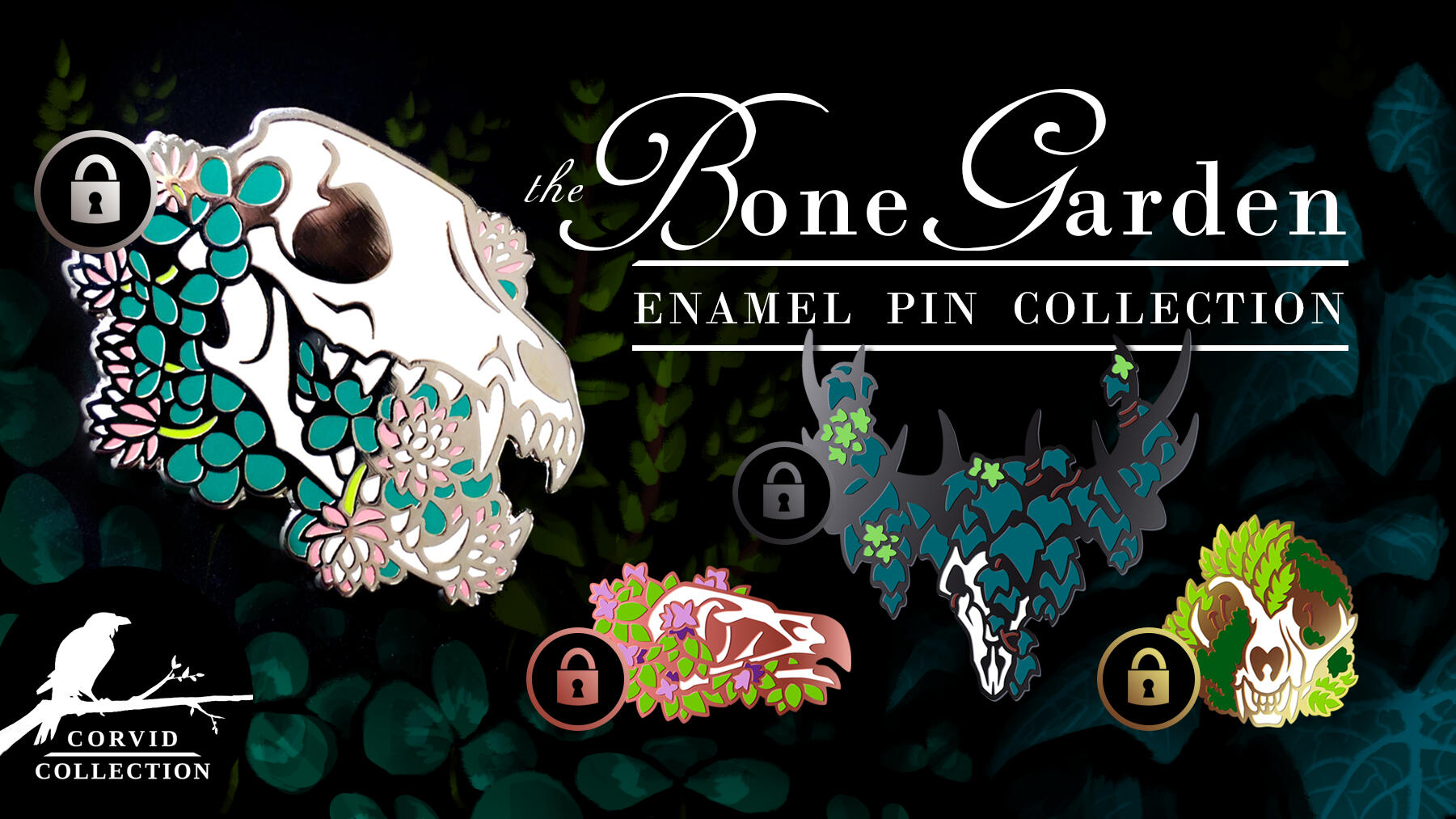 Materials for one of the Corvid Collection's Kickstarter projects, the Bone Garden Enamel Pin Collection, including Kickstarter graphics, orginal pins, and fine art prints.Role: Illustration, graphic design, product design.