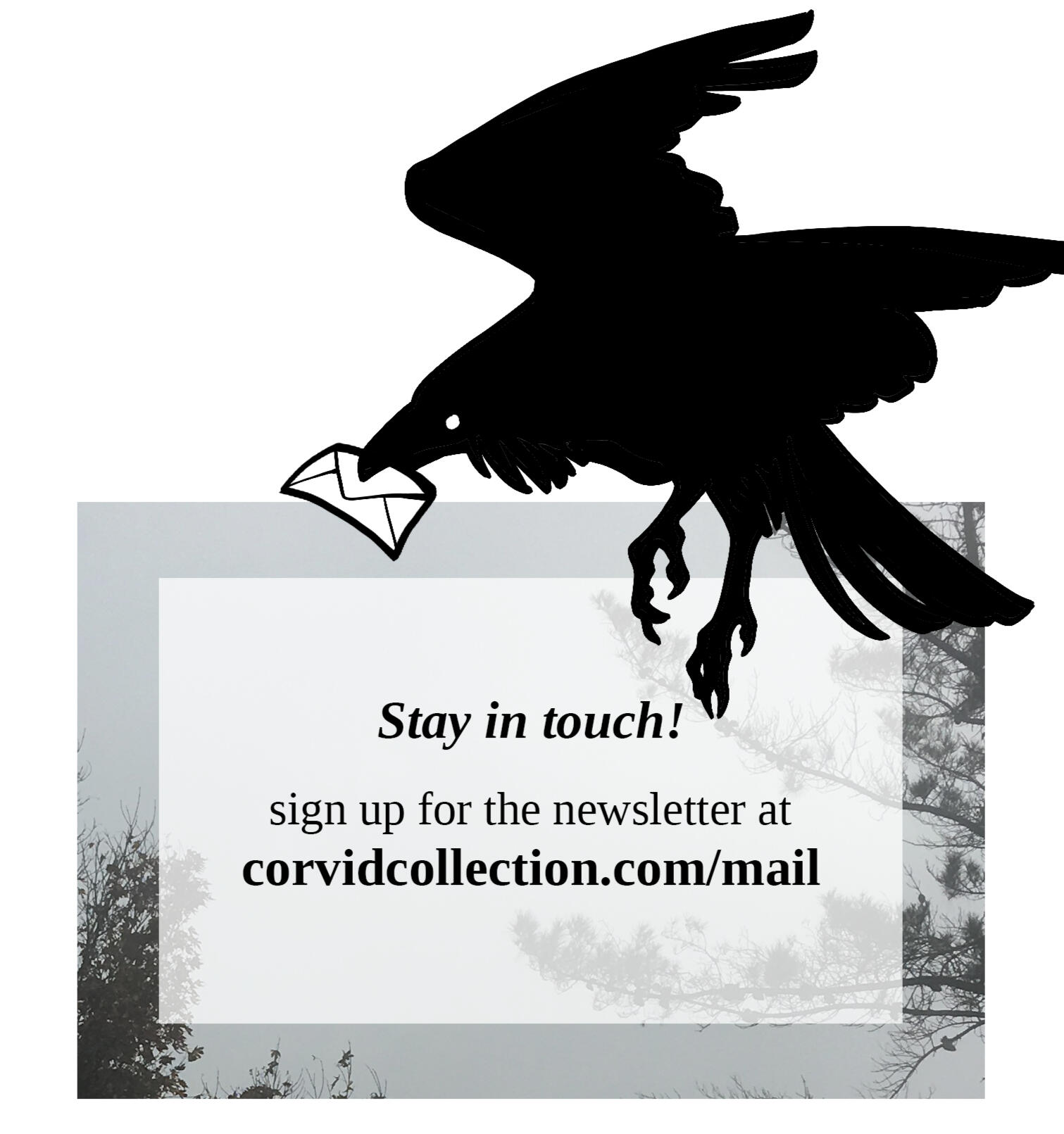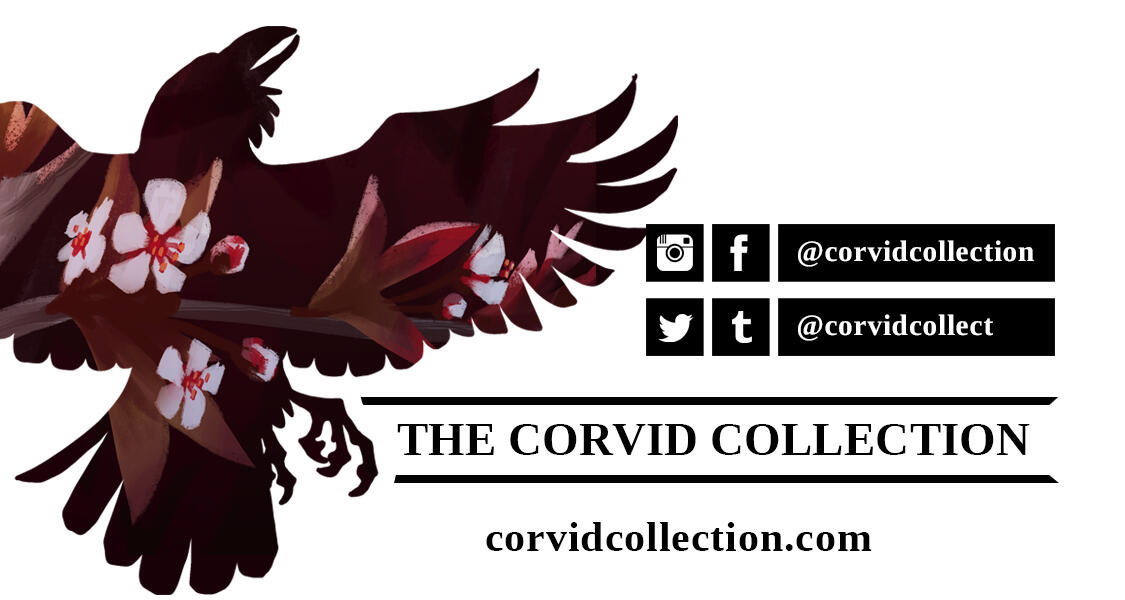 Work for the Corvid Collection, including the logo, website, marketing materials, and business cards. I started this small online shop in 2019 to sell original jewelry, prints, and enamel pins. Like its namesake, the Corvid Collection brand is gothic but playful. The marketing reflects that through colorful flowers, autumn leaves, and black birds with a relatable love for gathering shiny objects.Role: Illustration, graphic design, product & packaging design
