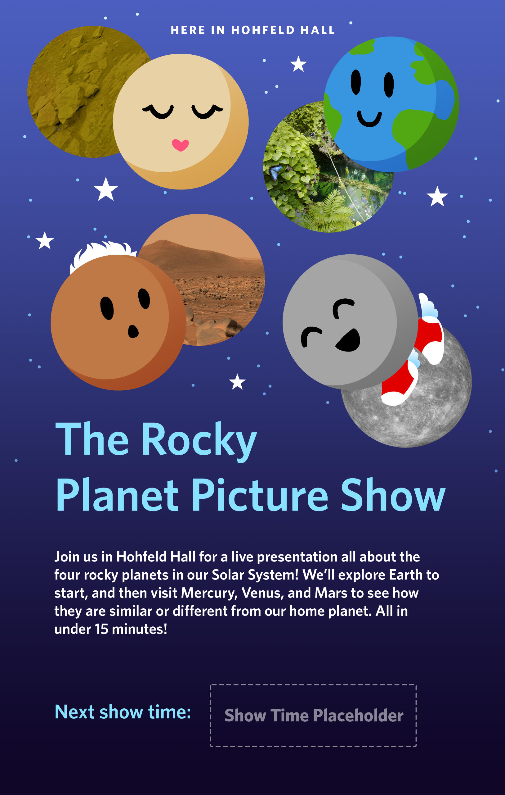 A poster for a show in Hohfeld Hall targeting museum guests from 2-5 years of age. The poster features original cartoons based on the Celestial Buddies, a line of planet-themed plush toys that were used as a part of the show.Role: Illustration, design