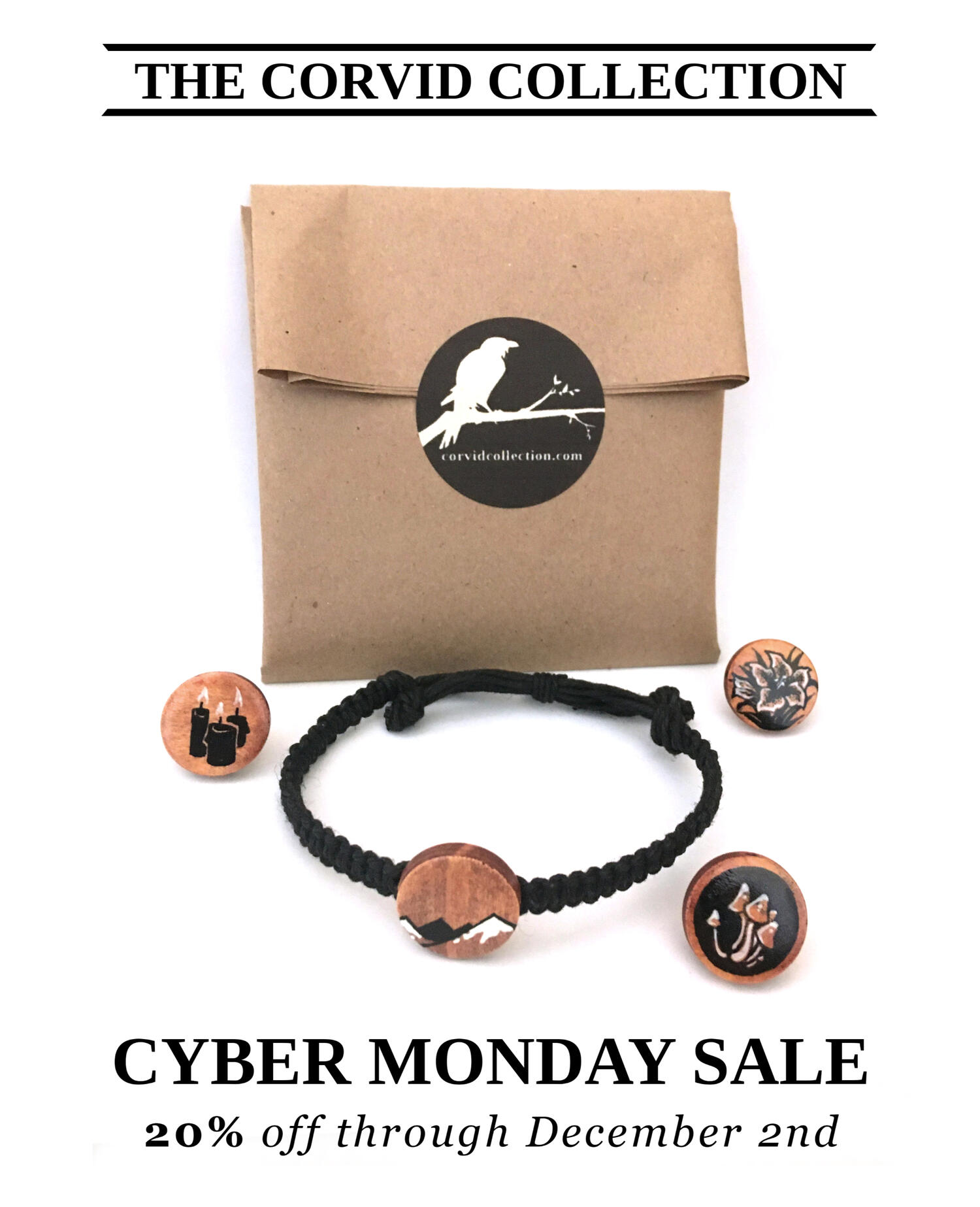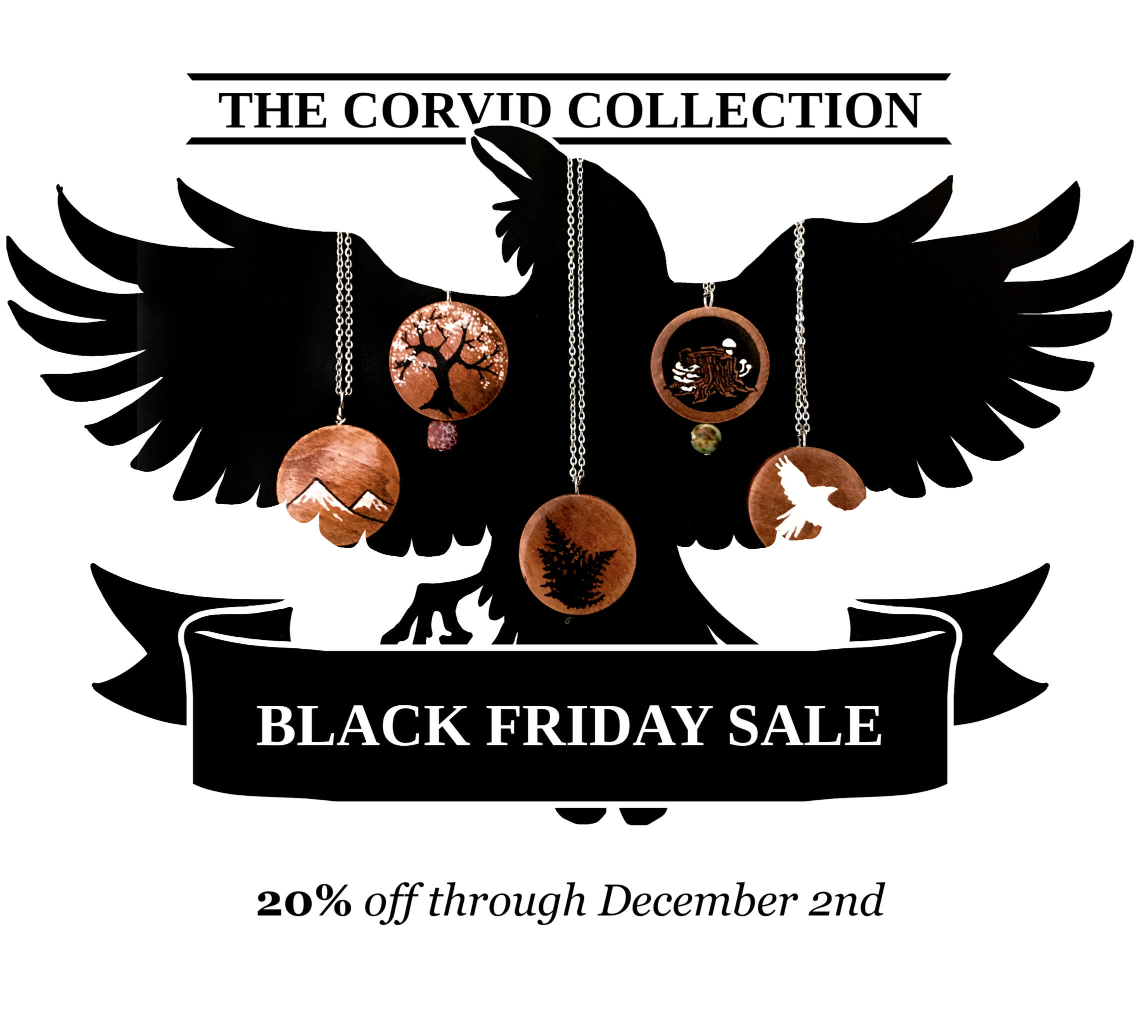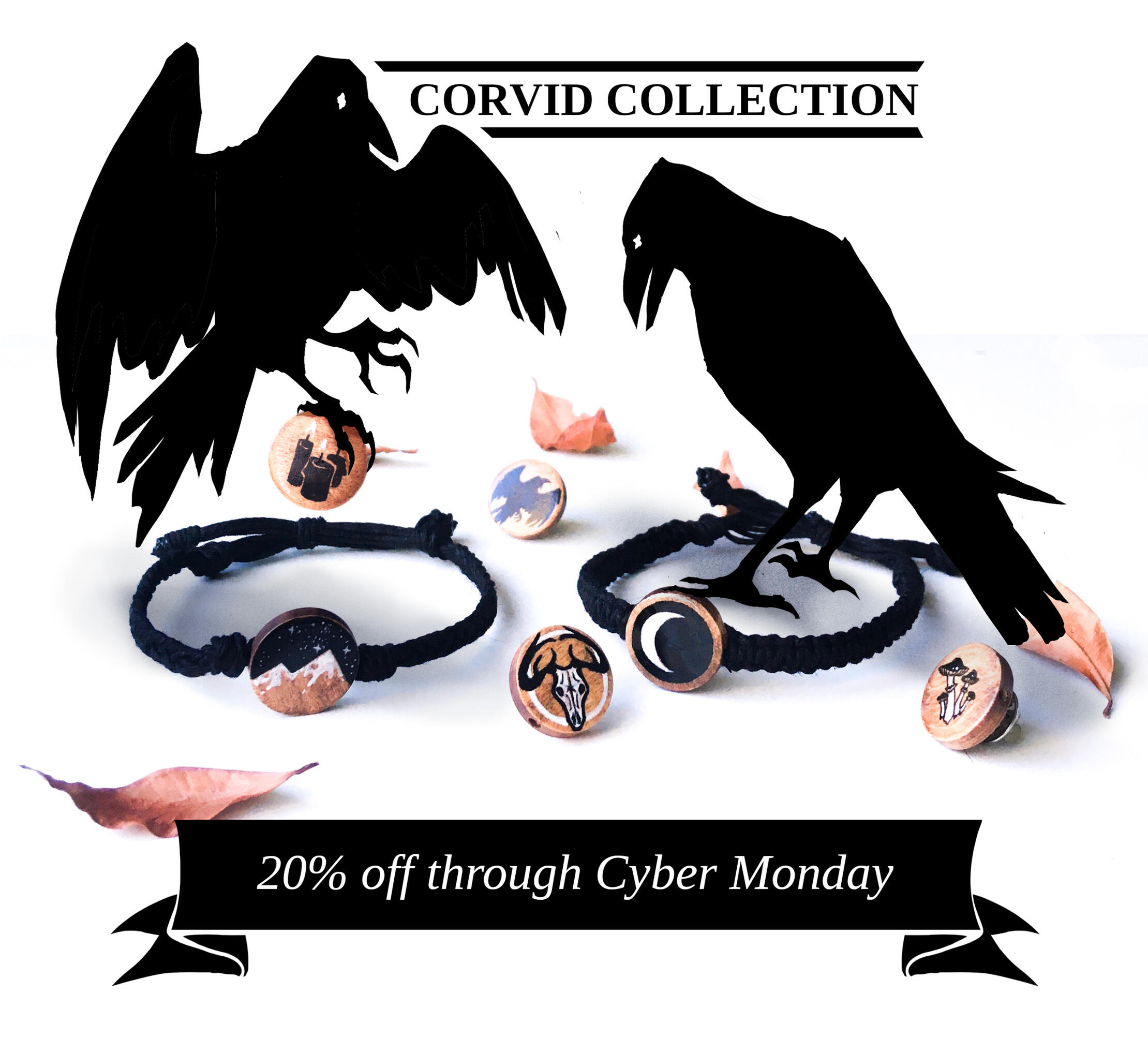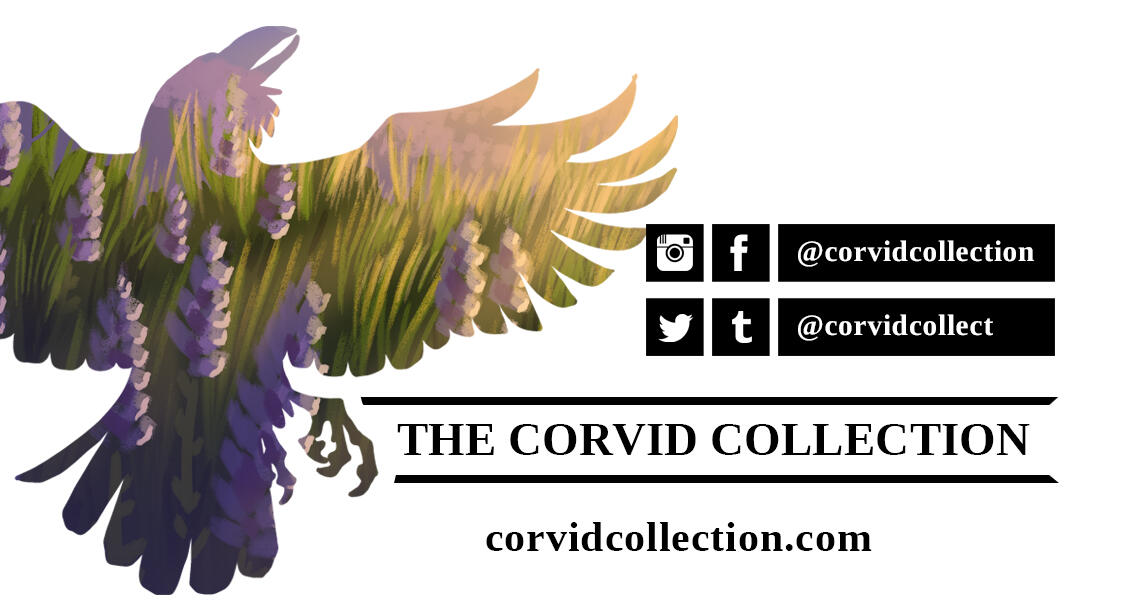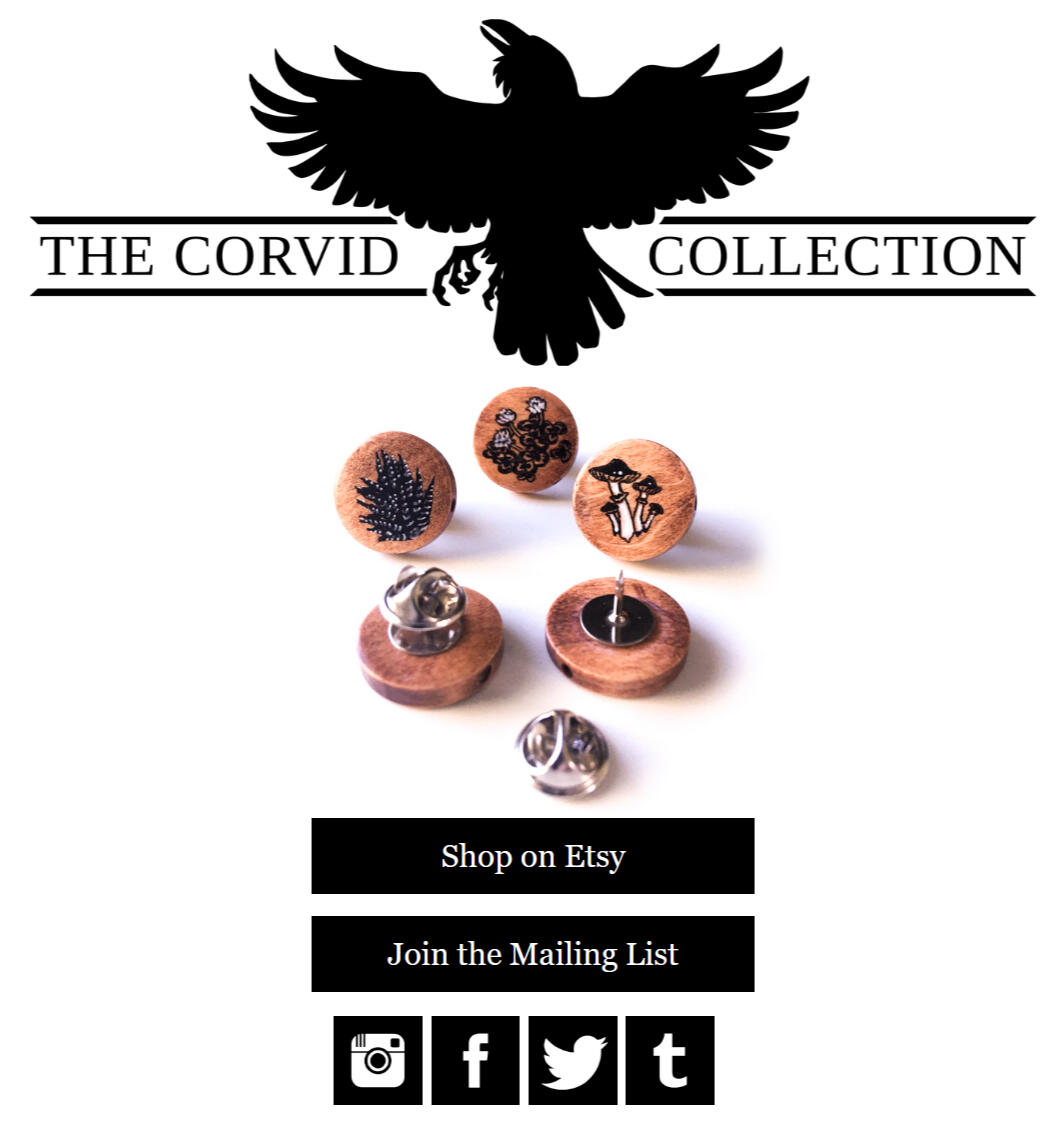 Work for the Corvid Collection, including the logo, website, marketing materials, and business cards. I started this small online shop in 2019 to sell original jewelry, prints, and enamel pins. Like its namesake, the Corvid Collection brand is gothic but playful. The marketing reflects that through colorful flowers, autumn leaves, and black birds with a relatable love for gathering shiny objects.Role: Illustration, graphic design, product & packaging design