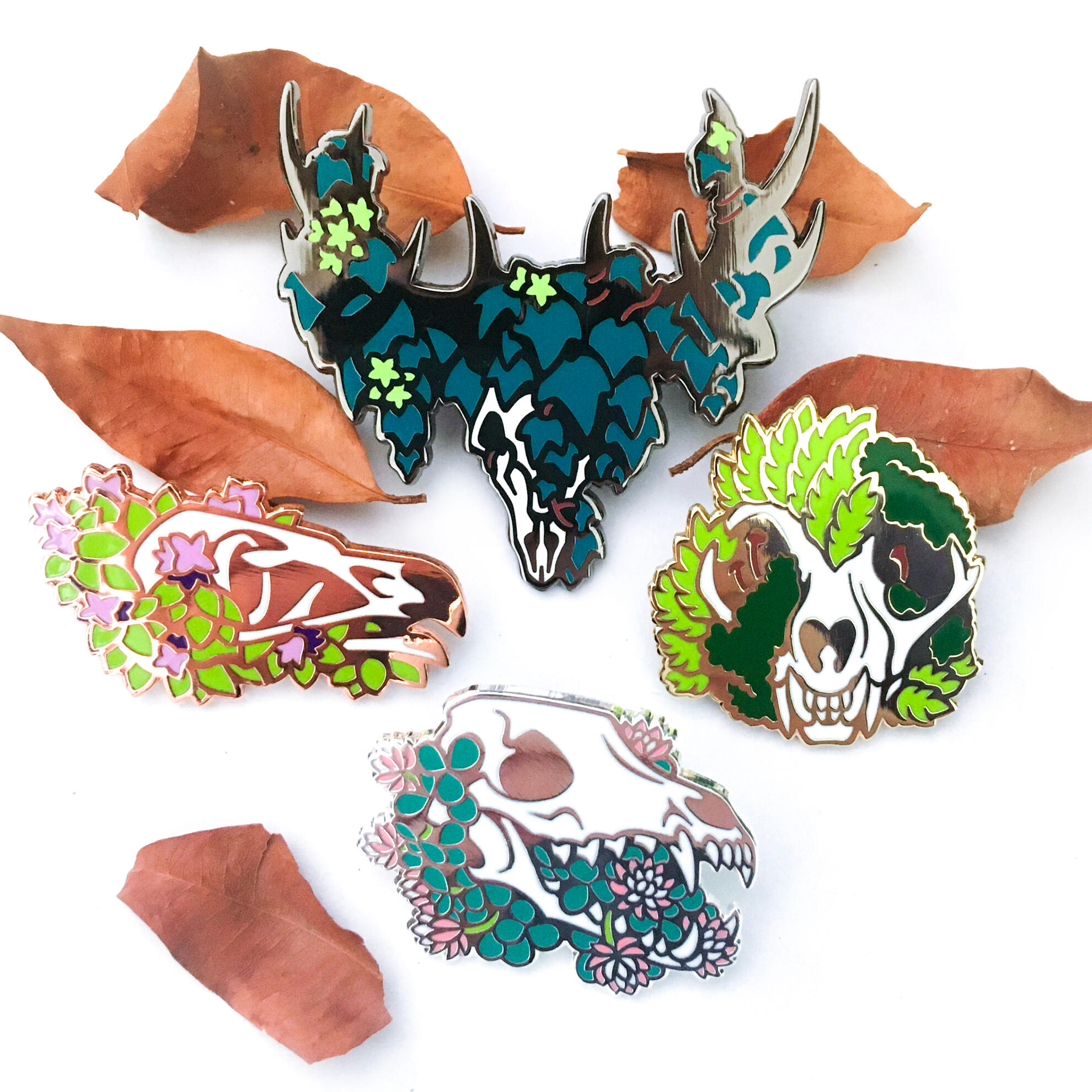Materials for one of the Corvid Collection's Kickstarter projects, the Bone Garden Enamel Pin Collection, including Kickstarter graphics, orginal pins, and fine art prints.Role: Illustration, graphic design, product design.